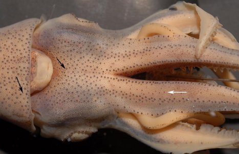Figure. Ventral view of the head, posterior region of arms IV and anterior region of mantle of A. heminuchalis, 35 mm ML, equatorial pacific, mature male. Note the small photophores present in the mid-region of arms IV (white arrow). Note, also, the large photophores surrounded by a ring of smaller photophores, two of which are indicted by the black arrows. Photograph by R. Young.