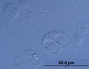Comments | Upper left - early plasmodium without myxospores. In the middle - plasmodium with sporoblast containing two spores. Below - mature myxospore. |