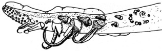 - Two rows of different-sized hooks on manus.