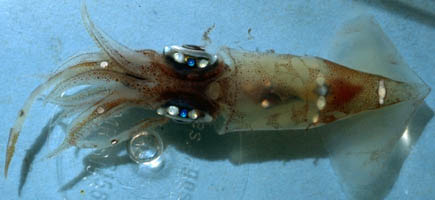 Species of Lycoteuthis are small squids with remarkable sexual dimorphism in body shape and photophore arrangement. Presumably they exhibit considerable bioluminescent courtship behavior which, unfortunately, has never been observed. These are thought to be mesopelagic squids, located primarily over island and continental slopes (Nesis, 1982), that undergo vertical migration into near-surface waters at night; however, little quantitative data on their vertical distribution has been obtained.