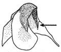 Figure. Anterior-oblique views of the lower beak. Arrows point to the step of both beaks. Left - Notonykia africanae, 100 mm ML, paratype. Modified from Nesis, et al., 1998. Right - Walvisteuthis virilis, mature male, NMNH specimen. The step ("angle ridge") lies just beyond the jaw angle where the rostral edge continues medially onto the lateral wall. That is, where the rostral edge merges into the lateral wall, the two are not flush along the medial beak surface. A well defined step is a characteristic feature of the lower beak of all members of the Onychoteuthidae. Such a step is seen outside the family only in Pholidoteuthis boschmai and to a lesser extent in some Enoploteuthis (Clarke, personal communication). Photograph by R. Young.