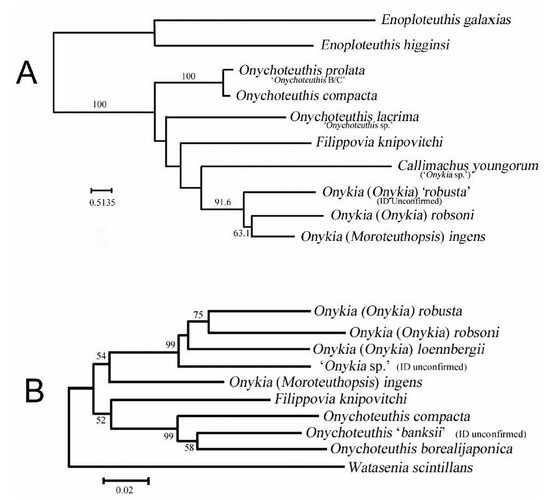 Figure. Summary of previous genetic studies on the Onychoteuthidae. A: ‘Tree obtained after neighbor-joining analysis of 16S sequences,’ modified from Bonnaud et al. (1998), fig. 6. B: ‘NJ tree of standard species and paralarvae’ (based on CO1 sequences), modified from Wakabayashi et al. (2007), fig. 2. Species names have been updated; where applicable, original species ID appears in smaller font following updated name. © (2010), Wakabayashi et al. (2007), Bonnaud et al. (1998).