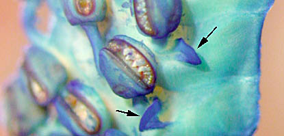 - Small flaps with short membranes present near bases of lateral club suckers (=abortive trabeculae ?); flaps not attached to protective membrane (see arrows in photograph below).
