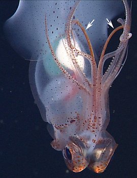The reason for the peculiar structure of arms IV is unknown. The following images provides clues to this problem. These photographs show the bases of arms IV, presumably the sucker-bearing region, locked together. The tentacles (arrows in 1st and 3rd photos, in the 2nd photo, the tentacles have curlicue ends) emerge, adjacent to one another, from the joined arms IV . Apparently the proximal, sucker-bearing region of arms IV, and their lateral membranes, form a single tentacular sheath for holding both tentacles. The value of this arrangement and the function of the bare, distal arms IV is unknown. Also, the coiling of the tentacles suggests that they are not strongly retractile.