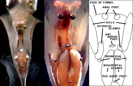1. May be reduced or absent on one side (unique in the Oegopsida) (see photograph of visceral photophores below).