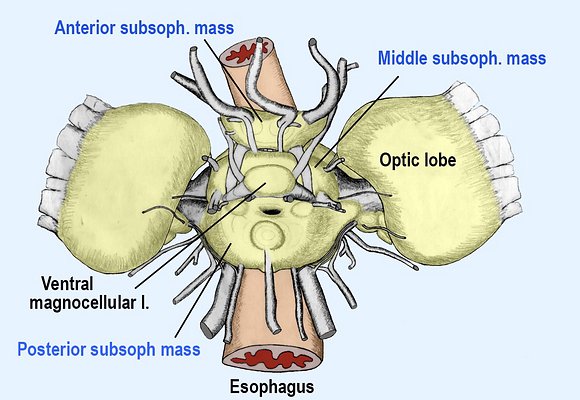 The masses of the more posterior portion of the brain are joined laterally by the complex basal lobes and the dorsal magnocellular lobes. The separate nature of the lobes that join the supra- and subesophageal masses and, therefore, evidence for two rather than one ancestral cords, is apparent from the presence of a fissure between these regions (see dark area in drawing of Vampyroteuthis brain) which completely separates them at one point and a ventral fissure between the middle and posterior subesophageal masses which forms a path for the cephalic arteries (not visible in this drawing).